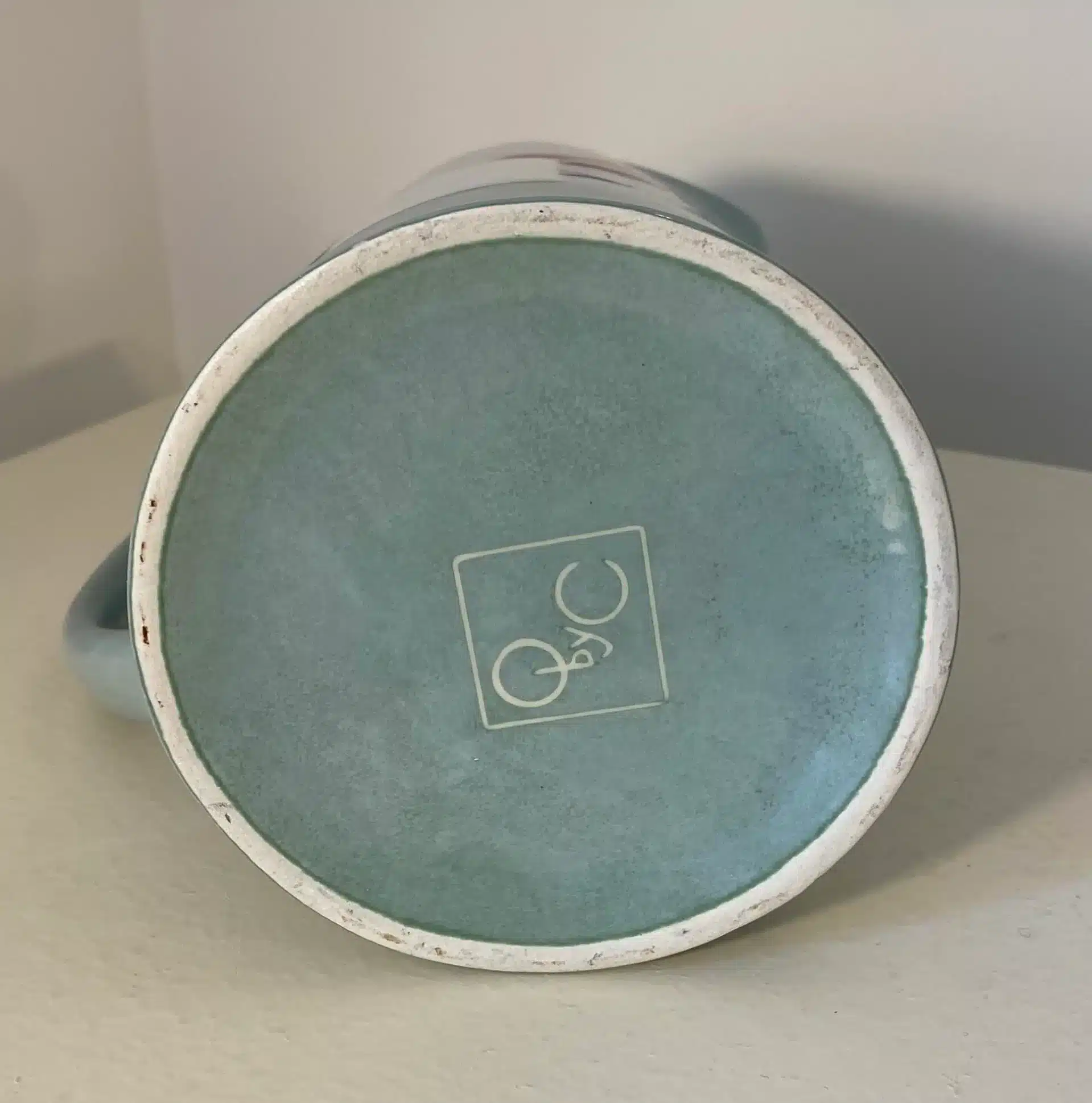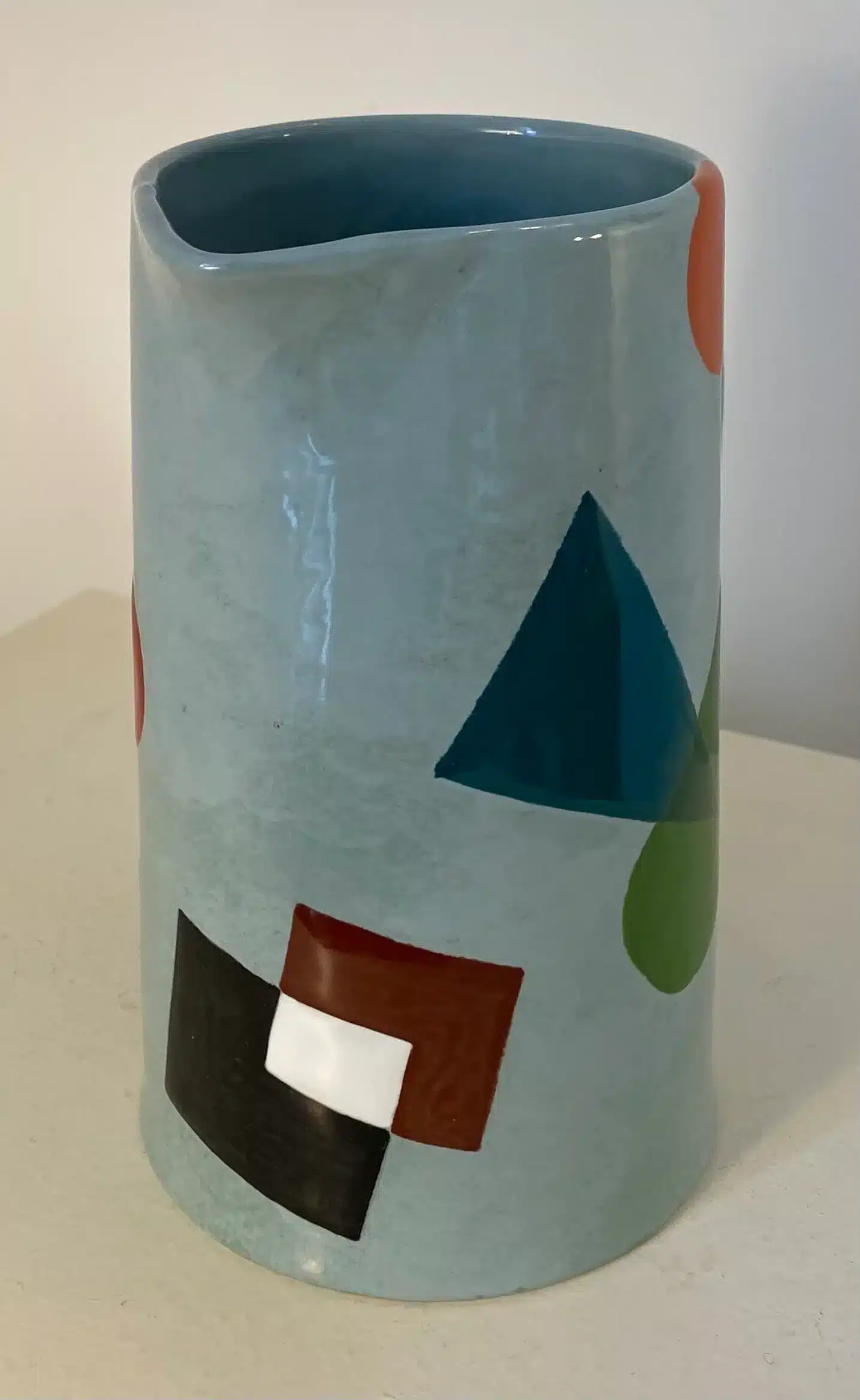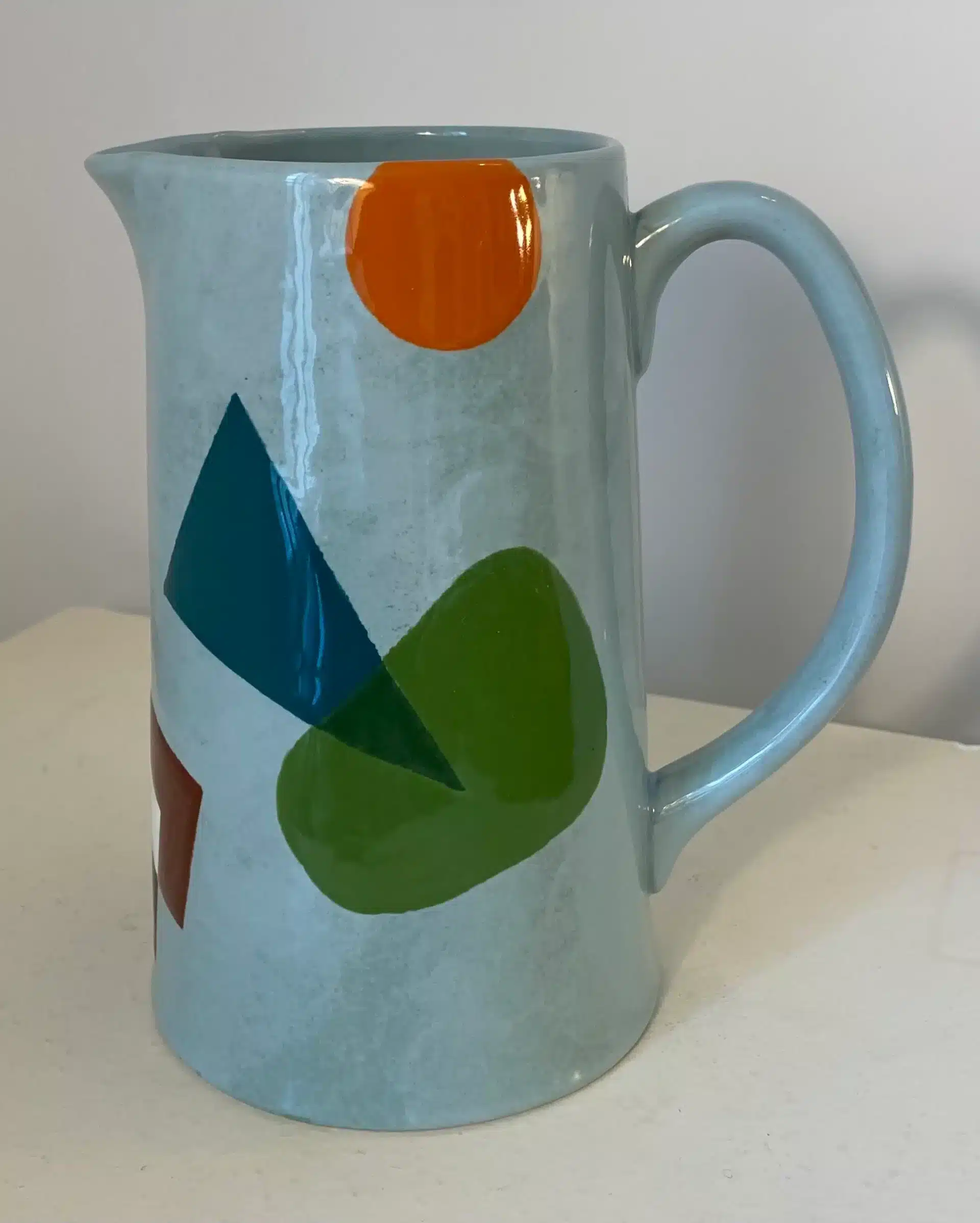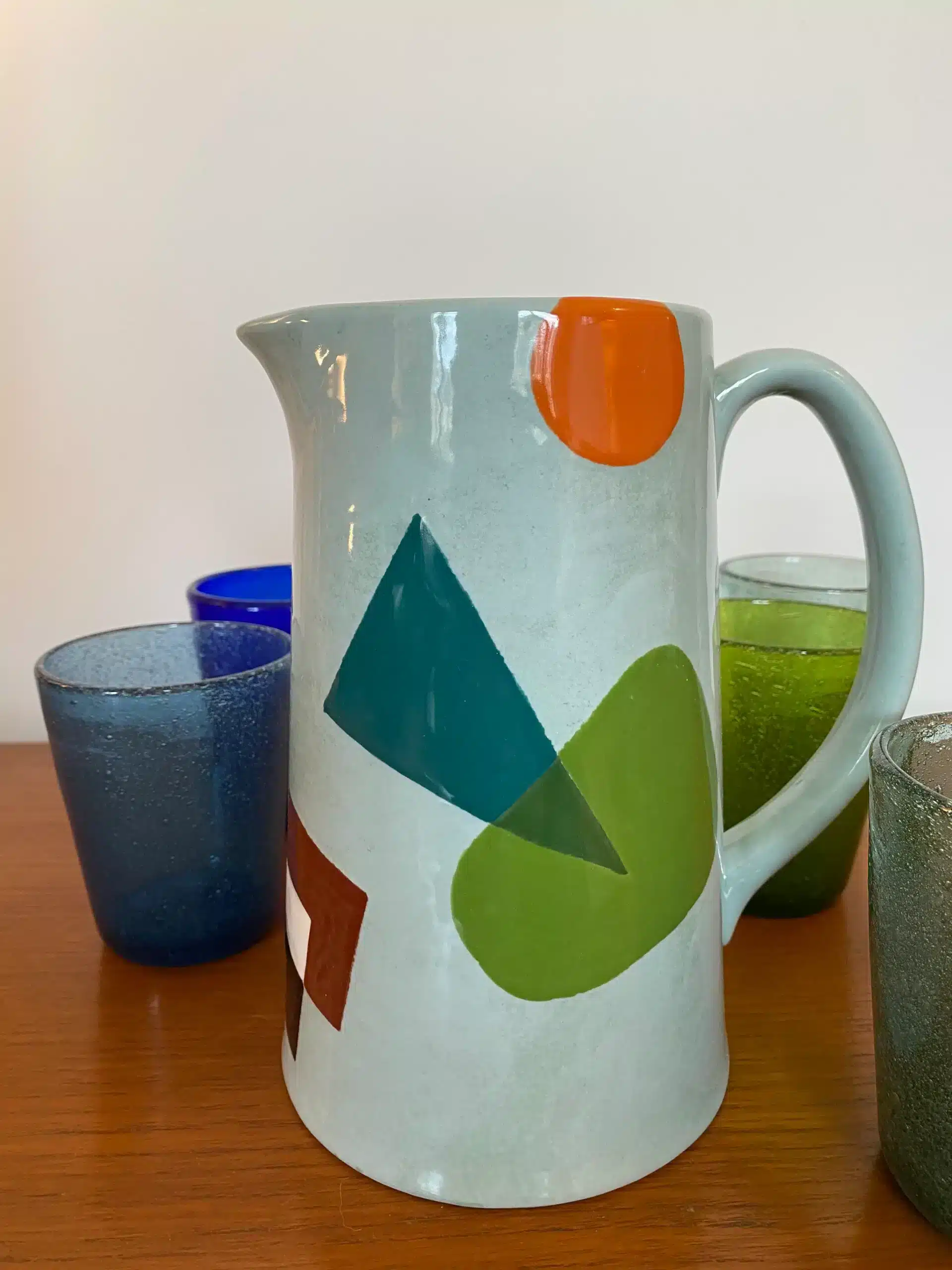 Pichet bleu ciel décoré de formes géométriques colorées.