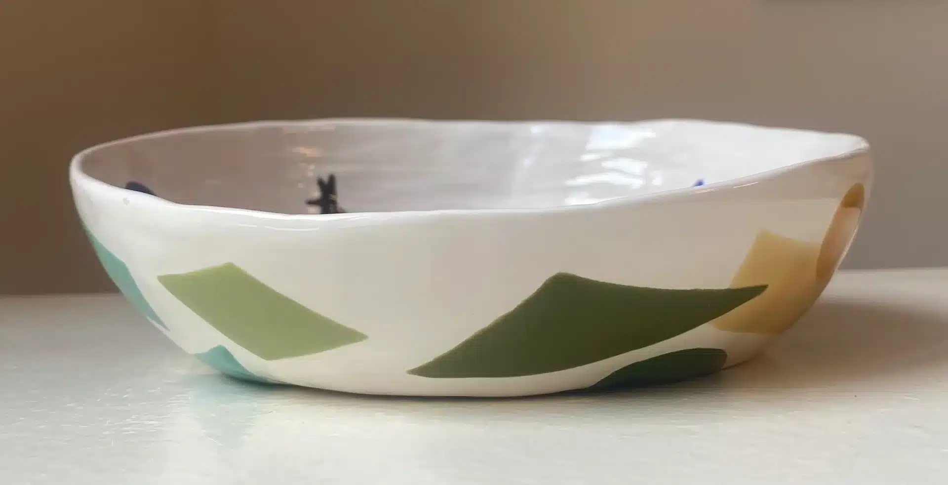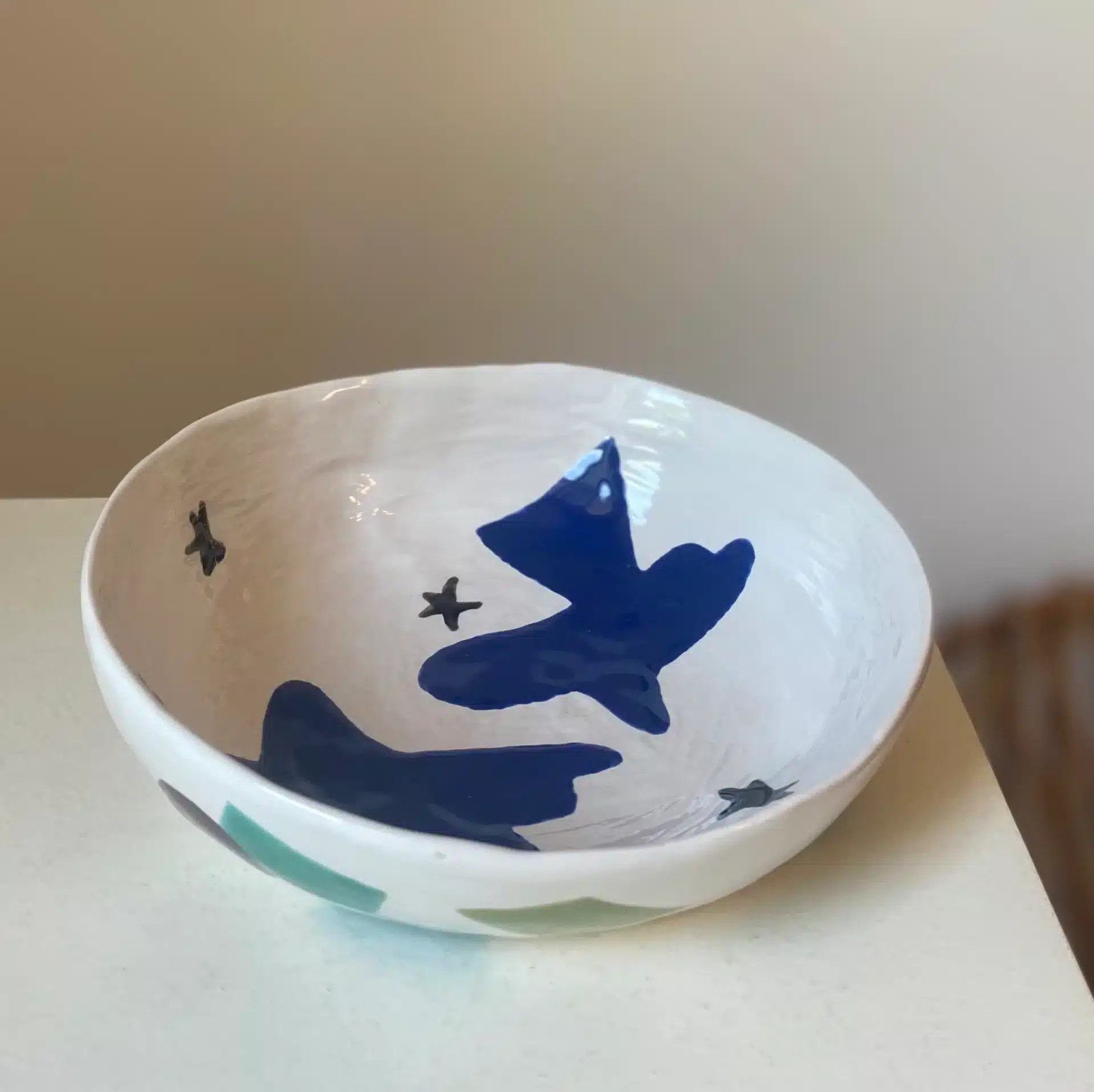 Saladier coloré blanc et bleu cubiste "colombes" modelé main.